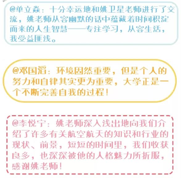 A1:在大学,大家基本处于同一起跑线,而自我管理能力强的人就容易脱颖而出。大学的自我管理主要体现在学习方面,在自主的情况下,能够有计划得完成学习任务,拒绝“拖延症”,这样就能让自己的学业水平保持在一个较高的层面。至于如何进行自我管理,我给出的建议是制定短期计划。每一个短期计划都是达成一个大目标的阶梯,而短期计划周期短,任务清晰,按部就班地执行对同学们来说并不难。短期计划也是“脚踏实地”的体现,希望长空学子既能“志存高远”,也能用科学方法规划好自己追逐梦想的路线。