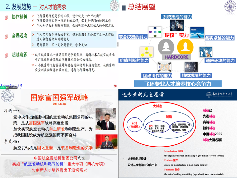 航空航天类专业学院高度重视专业节的筹备工作,众多“专业大咖”纷至沓来。例如校长聂宏从为什么选择飞设专业、飞设专业如何助力学生成长、飞设专业如何引导学生进行学术研究等角度阐述了我校飞设专业的历史贡献和发展优势。副校长宋迎东围绕学习飞动专业的意义、飞动专业的研究范畴和专业优势介绍了飞动专业,指出先进航空发动机是国家急需、必需的领域,意义重大。此外,中国科学院院士宣益民、国家特聘专家卢天健、长江学者袁慎芳、国防卓青谭慧俊等众多专业名师参与专业解读,通过系统的专业认知学习,促使学生对航空航天大类专业全面了解,进而结合自己的兴趣和潜能,进行合理的专业选择与学习。专业节的举办为航空航天类专业教师与本科生的交流提供了更便捷的渠道,是“以本为本、四个回归”的真切践行。