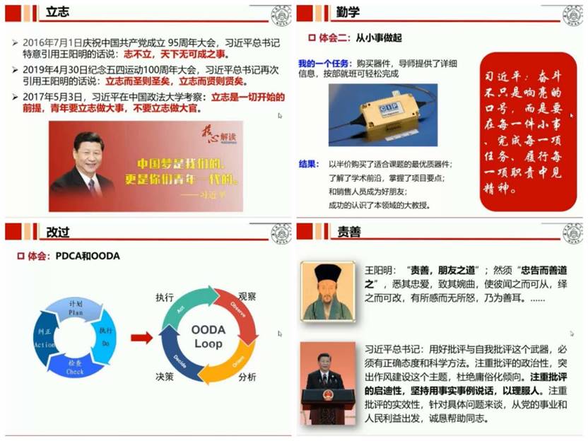 “你知道怎么成长吗?”潘时龙围绕王阳明提出的“立志、勤学、改过、责善”四个关键词分享了对于“成长”的理解。他以习总书记两次引用王阳明关于立志的名言为例,指出立志的重要性,随后又以黑石公司创始人苏世民的成功投资经历,再次勉励学生立大志、做大事。接着,潘时龙用“乐在其中”、“从小事做起”、“‘功利’学习法”、“以慢为快”、“善于学‘习’”五个“知识点”指导学生如何“勤学”。随后,潘时龙强调了“改过”能力的重要性,分享了对于PDCA和OODA两种改过方式的体会,指导学生在做任何事情之前都要经过分析、决策、执行、观察再回到分析,周而复始、不断纠正。关于“责善”,潘时龙指出,当代社会已经从“熟人社会”演变成为“陌生人社会”,也可以说是“孤独的社会”,有些青年不擅长与这样的环境建立关系,而大学生心理问题也与缺乏合作能力有较大关联,针对这一话题,潘时龙抛出了治疗孤独的五个方法:“花时间在一起,共享注意力”、“沟通对方都爱谈的话题”、“为对方的目标做点事”、“真心地进行夸奖”、“为身边人准备一些小礼物”,同时推荐学生阅读书籍《自卑与超越》。