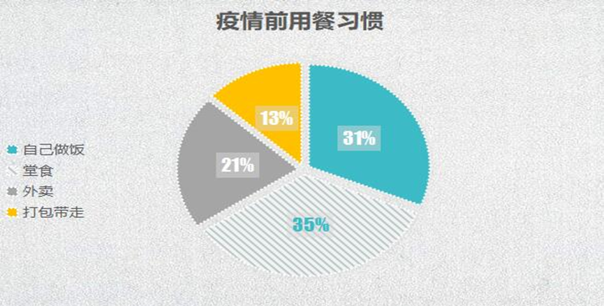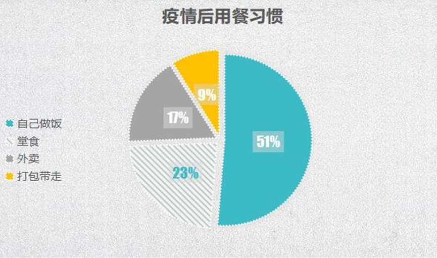 我们的一份主要针对青年人的网络调查显示疫情期间有65%的人选择自己做饭,只有9%选择堂食;疫而情后仍有50%的人选择自己做饭,堂食只有23%。这与疫情前这两项相差不大的情况相距甚远。