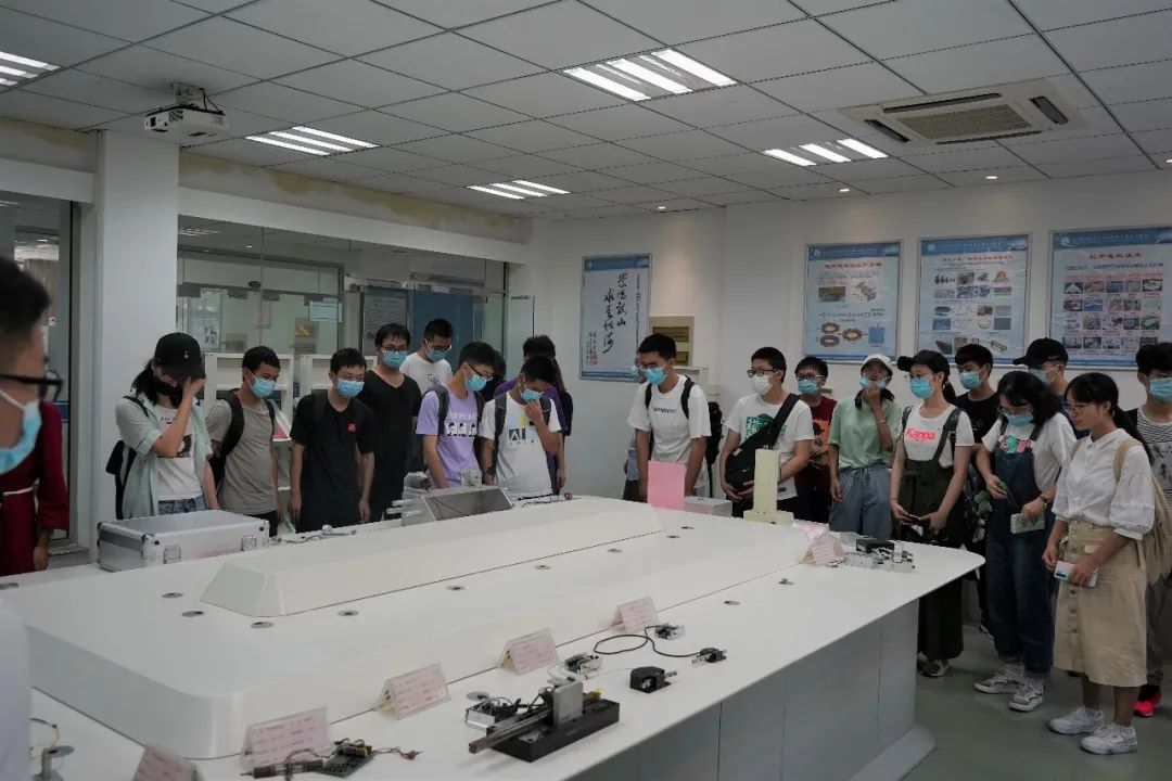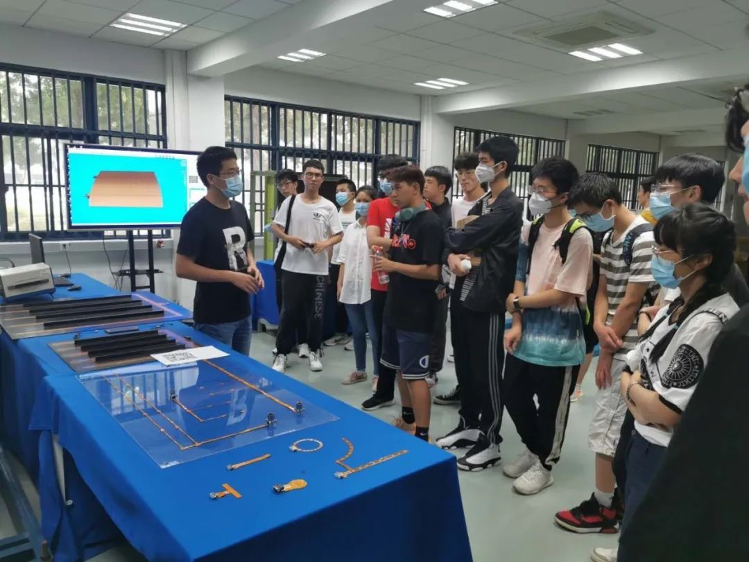 在精密驱动实验室,讲解员向同学们展示了实验室中各种各样的电机,介绍了超声电机与电磁电机的不同,并将拥有不同性能的十余种电机一一演示并结合高中物理知识向同学们简单讲解了其中原理。随后,讲解员借助实验室墙壁上的展板介绍了精密驱动实验室在赵淳生院士带领下的发展历程以及研究成果。