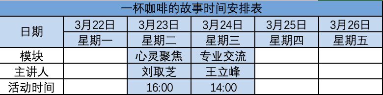 通过这次一杯咖啡的活动,我的许多迷茫疑惑都得到了解答,施校长用他丰富的知识和人生经验为我们指导方向,让我更加珍惜大学生活的宝贵,更加懂得学习机会的可贵!