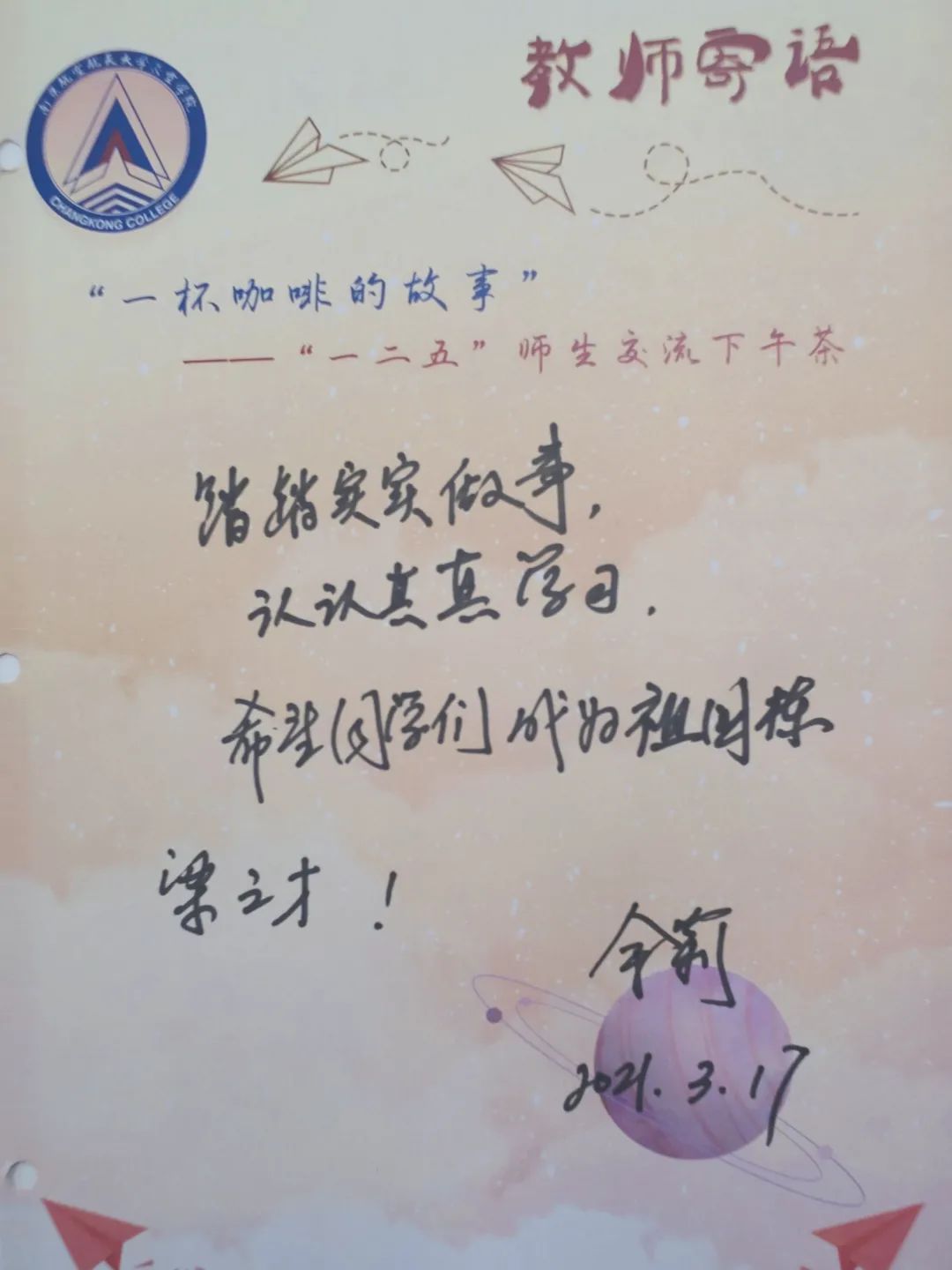此次“一杯咖啡的故事”系列活动,我们邀请了全国政协委员、pg游戏电子模拟器副校长、pg游戏电子模拟器院长施大宁来到学院与学生进行面对面交流。施校长与长空学子分享了两会学习感悟,指出“科技创新是经济社会发展的首要推动力,人才是科技创新的核心驱动力。高等教育对全社会知识水平、创新能力的提升起着重要作用。”此外,施校长也提及,总书记特别关注大学的办学特色,特别是谈到航空特色高校时,首先就提到了“南航”,借此勉励长空学子牢记谆谆嘱托,勇担培根铸魂使命。