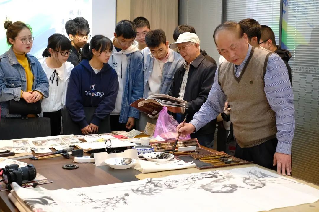 首先,在交流“从何时开始创作”这一问题时,张永荣老先生风趣地介绍了自己的“画疗”经历,他说“年幼时家乡的文化气息潜移默化地影响了自己对书画艺术的热爱,成年之后步入军旅生涯,20年没有绘画;44岁时,由于不幸染上癌症,便选择了闭门作画,6年后病情好转,一直作画到今日。”张老先生接着与同学们分享了与三位老先生们成立基金会捐助新疆贫困儿童的无私举动,勉励同学们努力学习科学知识,为祖国的航空事业做贡献。张老说“将文化艺术与自身专业知识相结合裨益良多,面对当今世界不了解,不认可中国传统艺术的现状,同学们需要立志传播中国文化,努力让中国传统文化走向世界”。