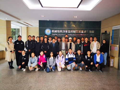参观伊始,机械结构力学及控制国家重点实验室办公室主任朱孔军教授向同学们简要介绍了国家重点实验室的定位和我校机械结构力学及控制国家重点实验室的基本情况。朱孔军老师指出,国家重点实验室作为国家科技创新体系的重要组成部分,是国家组织高水平基础研究和应用基础研究、聚集和培养优秀科学家、开展高层次学术交流的重要基地,实验室实行“开放、流动、联合、竞争”的运行机制。我校机械结构力学及控制国家重点实验室依托我校力学、航空宇航科学与技术、机械工程等国家重点学科,主要面向国家航空航天战略需求,结合现代科技的发展趋势,以先进飞行器为主要载体,以力学与控制、信息和材料等学科的交叉发展为特色,以原创性研究和系统集成为核心,开展结构动力学与控制、机械结构强度、振动利用与精密驱动、微纳系统力学和智能材料与结构等方向的研究。