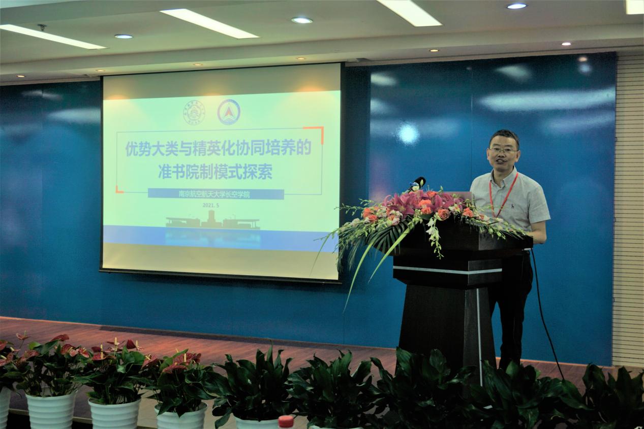 上午开幕式上,江苏省教育厅高教处处长邵进、南京师范大学副校长张连红、江苏高校荣誉教育联盟召集人王炜分别致辞。下午,蒋彦龙代表学院在会上作题为“优势大类与精英化协同培养的准书院制模式探索”的报告,介绍了南航“长空”精神和学院历史沿革,从智慧空间建设、培养体系重构、三全育人践行三个方面分享了学院“准书院制”建设的具体举措和相关成效。