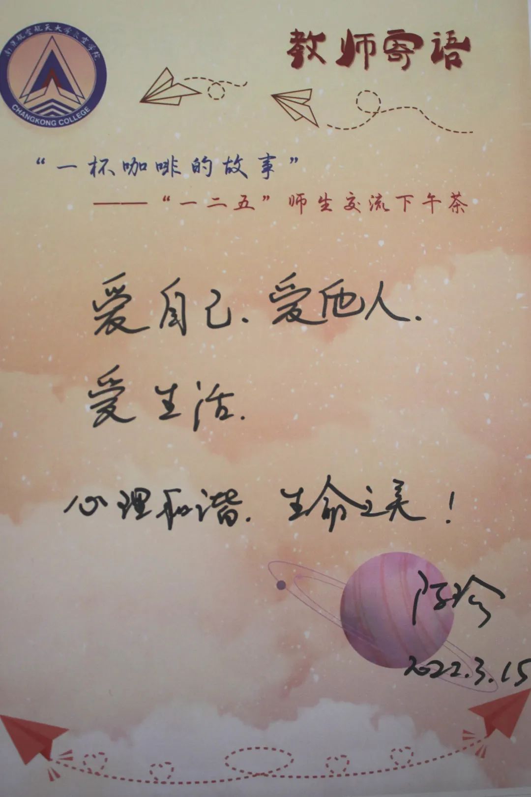 3月15日下午,南京大学社会学院博士、我校心理健康教育中心陈瑜老师做客pg游戏电子模拟器“一杯咖啡的故事”,与长空学子进行了一场亲切、温馨的交流。陈老师言语温柔,深入浅出,分析透彻,让在场的同学们在轻松温暖的氛围中收获了心灵启迪。