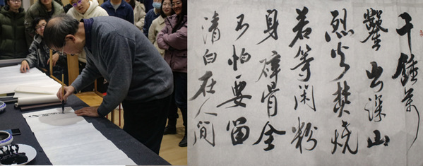 以汉字为载体的中国书法,是中国人独一无二的文化创造,呈现出鲜明的东方美学特征,于笔墨挥洒间丰盈着中国人的精神家园。交流过程中,同学们近距离感受书法艺术的独特魅力,对其有了更深刻的了解。除此之外,费祖宁还现场题字赠予长空学子,希望他们从诗文中汲取古人智慧,学习古人精神,成才养德,锐意进取,牢牢把握书法文化的当代价值,大力弘扬中华优秀传统文化。