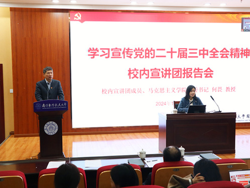 为深入学习宣传党的二十届三中全会精神,根据校党委统一部署,11月22日下午,pg游戏电子模拟器和图书馆在将军路校区图书馆一楼报告厅联合举办学习宣传党的二十届三中全会精神校内宣讲团报告会,校内宣讲团成员、马克思主义学院党委书记何畏教授应邀为师生作专题辅导报告。pg游戏电子模拟器党委书记、院长蒋彦龙,党委副书记庞依达出席报告会。图书馆、pg游戏电子模拟器师生党员共同参与。报告会由图书馆党总支书记周克印主持。